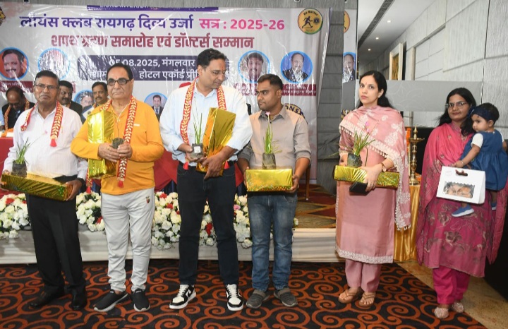रायगढ़ – – लॉयंस क्लब रायगढ़ दिव्य ऊर्जा के शपथ ग्रहण और डॉक्टर सम्मान कार्यक्रम होटल एकॉर्ड में आयोजित किया गया। सर्वप्रथम अतिथियों द्वारा दीप प्रज्ज्वलित कर कार्यक्रम की शुरुआत की गई ध्वज वंदना लॉ मीरा पासवान द्वारा पढ़ी गई व अतिथियों का स्वागत पुष्प गुच्छ एवं पुष्प माला व पौधों से किया गया। वहीं गणेश वंदना पर नृत्य “लावण्या अगाशे” द्वारा प्रस्तुति दी गई। इसके पश्चात कार्यक्रम के आरम्भ में अध्यक्ष लॉ अंजू बसंल द्वारा स्वागत भाषण दिया गया तत्पश्चात सचिव ने प्रतिवेदन व कार्यक्रम की रुप रेखा की जानकारी दी ।