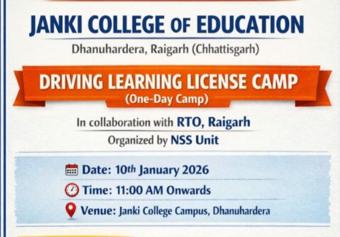 रायगढ़ – – शहीद नंदकुमार पटेल विश्वविद्यालय रायगढ़ से संबद्ध जानकी कॉलेज ऑफ एजुकेशन धनुहारडेरा रायगढ़ के राष्ट्रीय सेवा योजना इकाई के तत्वावधान में जिला परिवहन विभाग गडुमरिया रायगढ़ द्वारा जिला परिवहन अधिकारी के निर्देशानुसार तथा जानकी कॉलेज ऑफ एजुकेशन धनुहारडेरा रायगढ़ के चेयरमैन शिरीष सारडा व डायरेक्टर श्रीमती तृप्ति अग्रवाल के संरक्षण एवं प्राचार्य डॉ गजेंद्र चक्रधारी के कुशल मार्गदर्शन एवं कार्यक्रम अधिकारी रासेयो प्रो मयंक शीतल डनसेना के नेतृत्व में ड्राइविंग लर्निंग लाइसेंस बनाने हेतु एकदिवसीय शिविर का आयोजन दिनांक 10 जनवरी 2026 को सुबह 11 बजे से किया जा रहा है। शिविर में दोपहिया वाहन एवं चार पहिया वाहन हेतु ड्राइविंग लर्निंग लाइसेंस बनाया जाएगा। शिविर के लगने से जानकी कॉलेज ऑफ एजुकेशन धनुहारडेरा रायगढ़ के छात्र छात्राओं एवं आसपास के सभी ग्रामीण जन लाभान्वित होंगे तथा लायसेंस बनाने संबंधी , सड़क सड़क सुरक्षा यातायात जागरूकता आएगी।