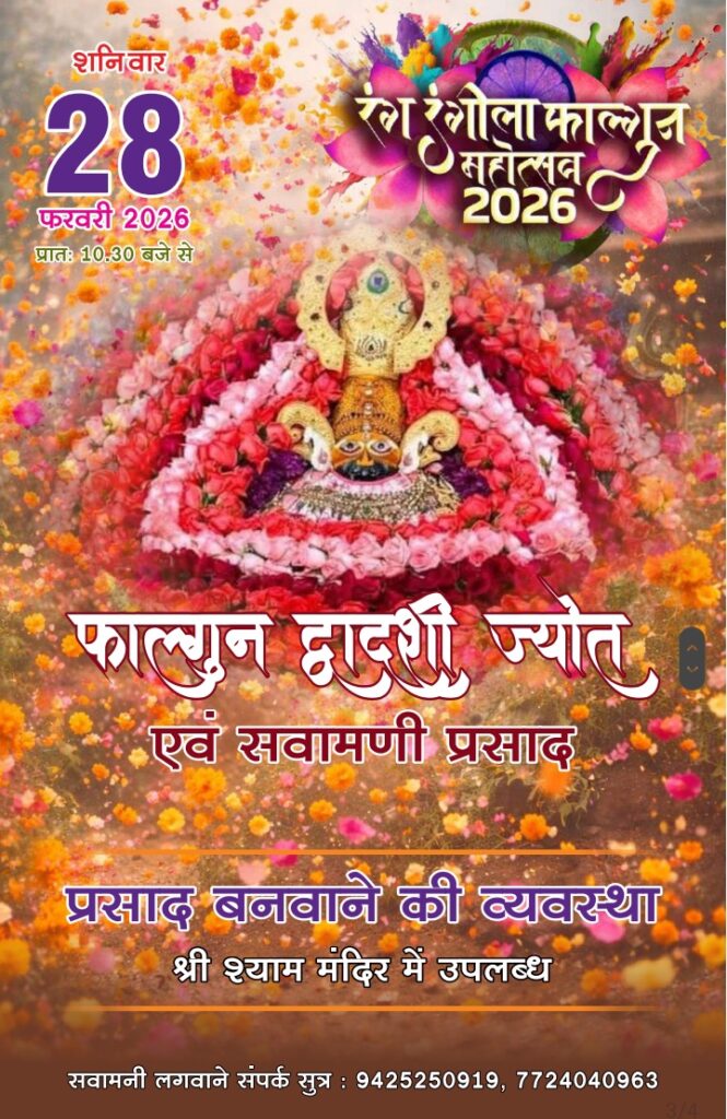28 को सवामनी होगा – – धार्मिक रंग रंगीला महोत्सव के दूसरे दिन 28 फरवरी द्वादशी तिथि को श्री श्याम मंदिर में बाबा श्री श्याम की विशेष पूजा अर्चना सुबह 10.00 बजे होगी। इसके पश्चात बड़ी श्रद्धा से सवामनी का भोग अर्पित किया जाएगा। वहीं सवामनी भोग चढ़ाने के लिए 9425250919, 7724040963 में संपर्क कर सकते हैं। वहीं प्रसाद बनवाने की व्यवस्था भी श्री श्याम मंदिर में उपलब्ध है। 4 को बाबा श्याम संग फूलों की होली – – रंग रंगीला महोत्सव के तृतीय भव्य धार्मिक आयोजन के अंतर्गत आगामी 4 मार्च को प्रभु श्री श्याम बाबा की पूजा अर्चना के पश्चात सुबह 9 बजे से दोपहर बारह बजे तक बाबा श्याम संग रंग ओर ग़ुलाल की यादगार होली खेली जाएगी। जिसमें सभी श्याम प्रेमी शामिल होंगे। इसी तरह शाम को 5 बजे से रात 9 बजे तक श्री श्याम दरबार में भक्तो द्वारा बाबा संग फूलो की होली खेली जाएगी एवं स्वल्पाहार के साथ बड़ी आत्मीयता के साथ यादगार होली मिलन समारोह का आयोजन होगा।