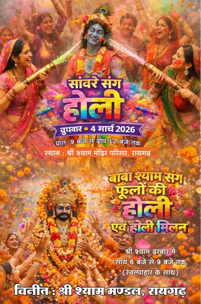 रायगढ़ – – शहर के संजय कॉम्प्लेक्स स्थित राज्य प्रसिद्ध श्री श्याम मंदिर में हर वर्ष फाल्गुन मास में होली के पावन अवसर पर रंग रंगीला फागुन महोत्सव का आयोजन श्री श्याम मंडल रायगढ़ के सदस्यगण करते हैं जो शहरवासियों के लिए बेहद ही खास रहता है। वहीं इस बार भी अध्यक्ष बजरंग अग्रवाल लेंध्रा के विशेष मार्गदर्शन में तीन दिवसीय रंग रंगीला महोत्सव का भव्य आयोजन किया जा रहा है। कार्यक्रम के पहले दिन आज रात्रि 8 बजे से भजन संध्या का यादगार आयोजन किया जा रहा है।जिसमें देश के सुप्रसिद्ध कलाकार अपने मधुर भजन गीतों से महोत्सव को यादगार बनाएंगे।