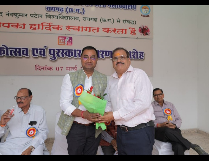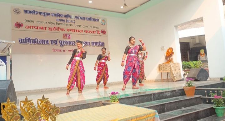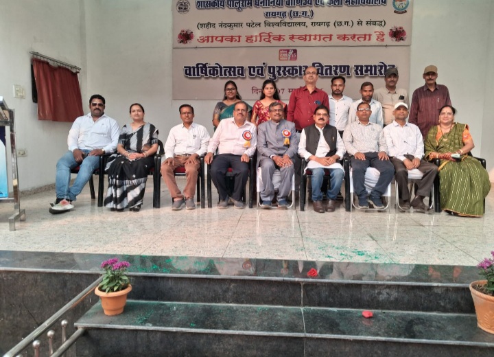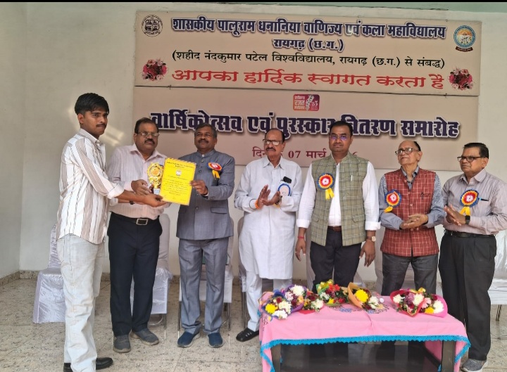 प्रतिभावान विद्यार्थियों का किया गया सम्मान रायगढ़ – – शनिवार को शासकीय पालूराम धनानिया वाणिज्य एवं कला महाविद्यालय रायगढ़ में वार्षिकोत्सव का भव्य आयोजन मनाया गया। वहीं इस संबंध में विस्तृत जानकारी देते हुए कालेज के छात्र शाखा प्रभारी असीम श्रीवास्तव ने बताया कि इस दौरान विभिन्न सांस्कतिक कार्यक्रम एवं पुरस्कार वितरण समारोह आयोजित हुए। सुबह से ही परिसर में विद्यार्थियों की चहल-पहल और रंग-बिरंगी सजावट ने प्रांगण को उत्सवमय बना दिया। कार्यक्रम प्राचार्य डॉ. सुशील कुमार एक्का की अध्यक्षता एवं संरक्षण, संयोजक डॉ. हेमकुमारी पटेल एवं क्रीडाधिकारी डॉ. सौरभ प्रधान के मार्गदर्शन में सम्पन्न हुआ। सरस्वती वंदना से आगाज़ – – वार्षिकोत्सव का आरंभ छात्र श्री रितेश एवं छात्रा सुश्री ईशा चौहान ने मधुर स्वर में सरस्वती वंदना और छात्रा मेद्या मानिकपुरी एवं सुश्री सिया वर्मा द्वारा स्वागत गान एवं छ.ग. महतारी गीत से हुआ। अतिथियों द्वारा दीप प्रज्वलन कर कार्यक्रम की शुरूआत की गई। प्राचार्य डॉ. एक्का ने अपने उद्बोधन में महाविद्यालय के वार्षिक प्रतिवेदन पर प्रकाश डालते हुए कहा कि लगभग डेढ़ हजार विद्यार्थियों की संख्या, एनईपी 2020 के दीक्षारम्भ समारोह, कौशल विकास और भवन निर्माण कार्य सहित अखिल भारतीय स्तर ही नहीं अपितु अंतरराष्ट्रीय पटल पर ओडिसा, नेपाल, श्रीलंका और महाराष्ट्र सहित दो अंकों में राज्यों की भागीदारी के बारे में बताया। उन्होंने एनसीसी, एनएसएस, थल सेना कैम्प और नशा मुक्ति विषय आधारित सात दिवसीय शिविर में विद्यार्थियों की भागीदारी की बात कहते हुए शुभकामनाएं दीं तथा खासतौर पर विधि विभाग की उपलब्धियों को सराहा।  विधि विभागाध्यक्ष प्रदीप कुमार शर्मा ने विधि सम्मत दायरे में सकारात्मकता की ओर बढ़ने की सीख दी व कहा कि विधि विभाग के नवीन भवन का कार्य भी प्रगति पर है।