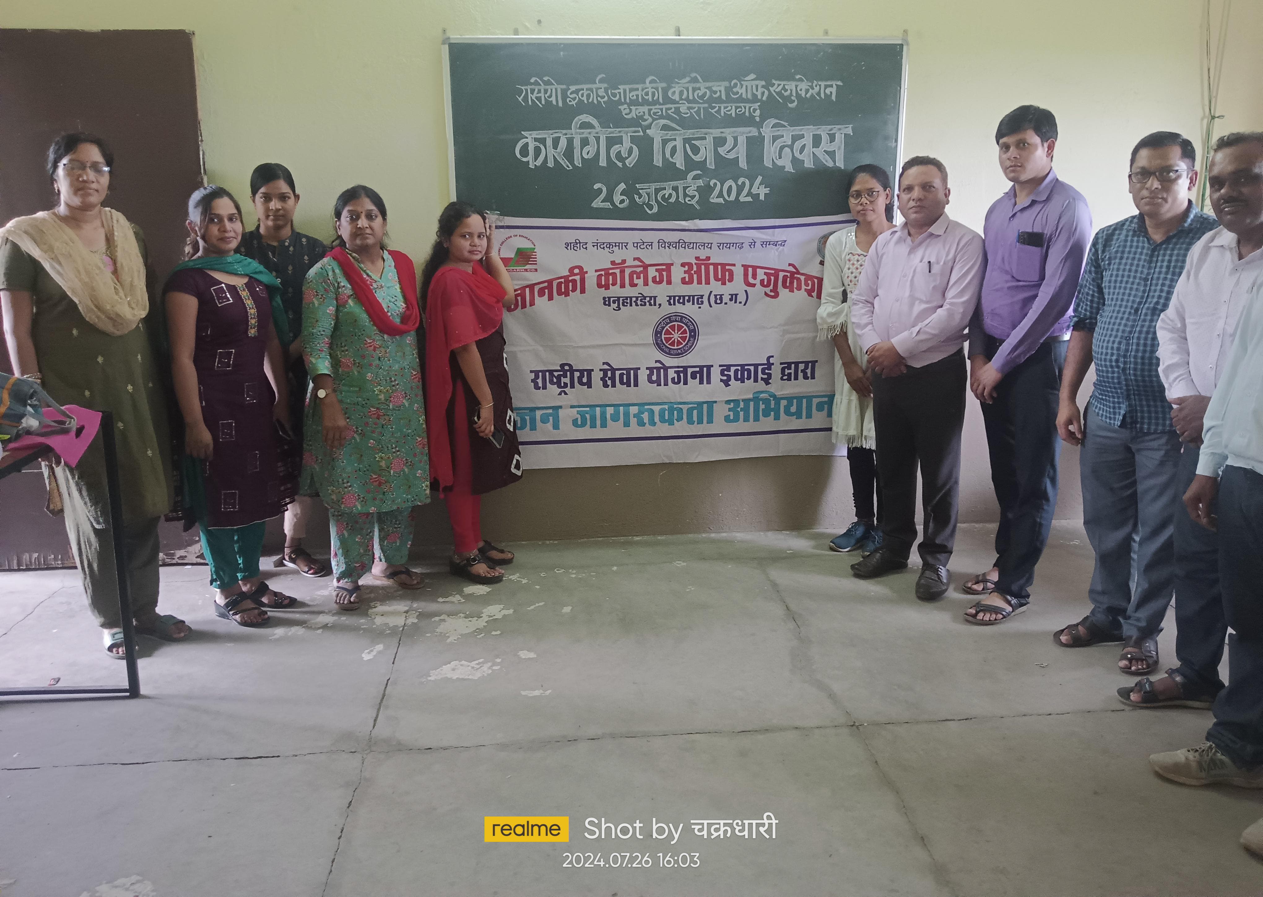रायगढ़ – – जानकी कॉलेज ऑफ एजुकेशन धनुहारडेरा, रायगढ़ में शहीद नंदकुमार पटेल विश्वविद्यालय रायगढ़ रासेयो प्रकोष्ठ के दिशा निर्देश पर,जानकी कॉलेज ऑफ एजुकेशन के चेयरमैन श्री शिरीष सारडा व डायरेक्टर श्रीमती तृप्ति अग्रवाल के संरक्षण तथा प्राचार्य डॉ गजेंद्र चक्रधारी के कुशल मार्गदर्शन एवं रासेयो कार्यक्रमअधिकारी प्रो मयंक शीतल डनसेना के नेतृत्व में कारगिल विजय दिवस देशभक्ति से ओतप्रोत वातावरण में उत्साह और उमंग से मनाया गया।सर्वप्रथम कारगिल युद्ध में शहीद वीर जवानों की वीरता को नमन और याद करते हुए उन्हें श्रद्धा सुमन अर्पित कर भावपूर्ण श्रद्धांजलि दी गई। चेयरमैन शिरीष सारडा कहा कि आज का दिन भारतीय इतिहास के स्वर्णिम पन्नो में अंकित है हमें हमारे देश के वीर जवानों पर नाज है।संस्था के डायरेक्टर श्रीमती तृप्ति अग्रवाल ने देश के साहसी वीर सैनिकों के बलिदान को स्मरण करतें हुए कारगिल विजय दिवस पर केंद्रित देश भक्ति से ओतप्रोत विचार साझा कर छात्र छात्राओं को राष्ट्र भक्ति के लिए प्रेरित किया। प्राचार्य डॉ गजेंद्र चक्रधारी ने कारगिल युद्ध में वीरगति को प्राप्त हुए वीर जवानों को पुण्य स्मरण करते हुए कहा कि हमारे लिए राष्ट्र हित और राष्ट्र प्रेम सर्वोपरि होना चाहिए। हमें देश के वीर सपूतों से प्रेरणा लेकर देश प्रेम अपने भीतर जागृत करना चाहिए। इस गरिमामय कार्यक्रम में कॉलेज के प्रो विवेक कांबले, नरेंद्र प्रधान, विद्यानंद पटेल, प्रो शरद पंडा, सीताराम कैवर्त्य, प्रो भरत सिदार , प्रो सुजाता दास, श्रीमती शांति महंत , प्रो अंजु पटेल , दीक्षा प्रधान,प्रो हिमा पटेल,प्रो बसंत बेहरा सहित राष्ट्रीय सेवा योजना के स्वयं सेवक छात्र छात्राओं की उपस्थिति रही ।